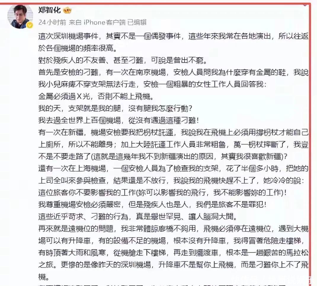 舆论瞬间反转。我看着评论区从“心疼郑智化”变成“感觉被打脸”,有人翻出他发微博的时间——登机后仅21分钟,飞机起飞前就发了文,压根没给机场沟通的机会。更让网友不满的是,他随后又吐槽南京机场要脱金属义肢、新疆机场要托运拐杖,可业内人士很快科普:这些都是全国统一的安全规定,并非针对他个人。